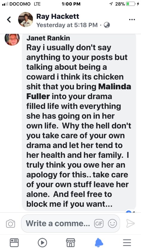 Ray i usually don’t say anything to your posts but talking about being a coward i think its chicken shit that you bring Malinda Fuller into your drama filled life with everything she has going on in her own life. Why the hell don’t you take care of your own drama and let her tend to her health and her family. I truly think you owe her an apology for this.. take care of your own stuff leave her alone. And feel free to block me if you want…