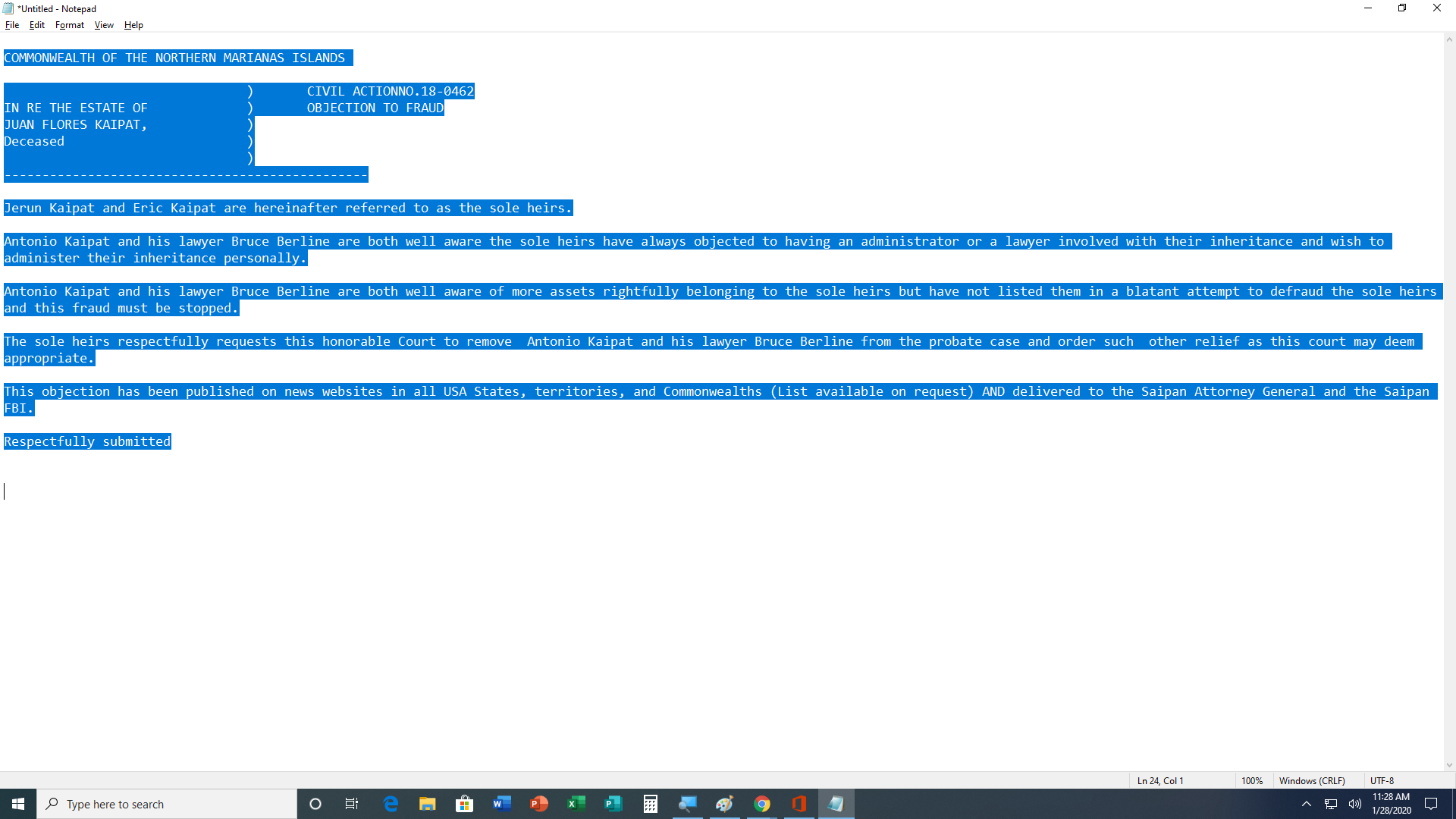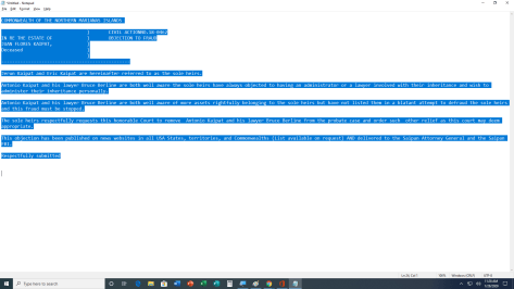 Antonio Kaipat and his lawyer Bruce Berline are both well aware of more assets rightfully belonging to the sole heirs but have not listed them in a blatant attempt to defraud the sole heirs and this fraud must be stopped.